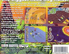 The action of Sunday! Sunday! Sunday! can be played on Tuesday! Tuesday! Tuesday! DARE DEVIL DERBY 3D brings all of the action of destruction derby to the PlayStation. Pick your car and hit the track as well as your opponents in the six single-player modes. In Grand Prix, finish in the top three to advance through 10 different races, or take on all 10 races and have the highest point total at the end of the World Series. If the track is too crowded, play the one-on-one mode or go through a series of one-on-one races in the Championship, and try to keep from finishing last in the Knockout mode. If your friends give you grief about the damage you keep taking, challenge them in one of the seven multiplayer modes and race through canyons, city streets, and even underwater. With all of these modes, DARE DEVIL DERBY 3D will keep destruction derby fans happy for months.